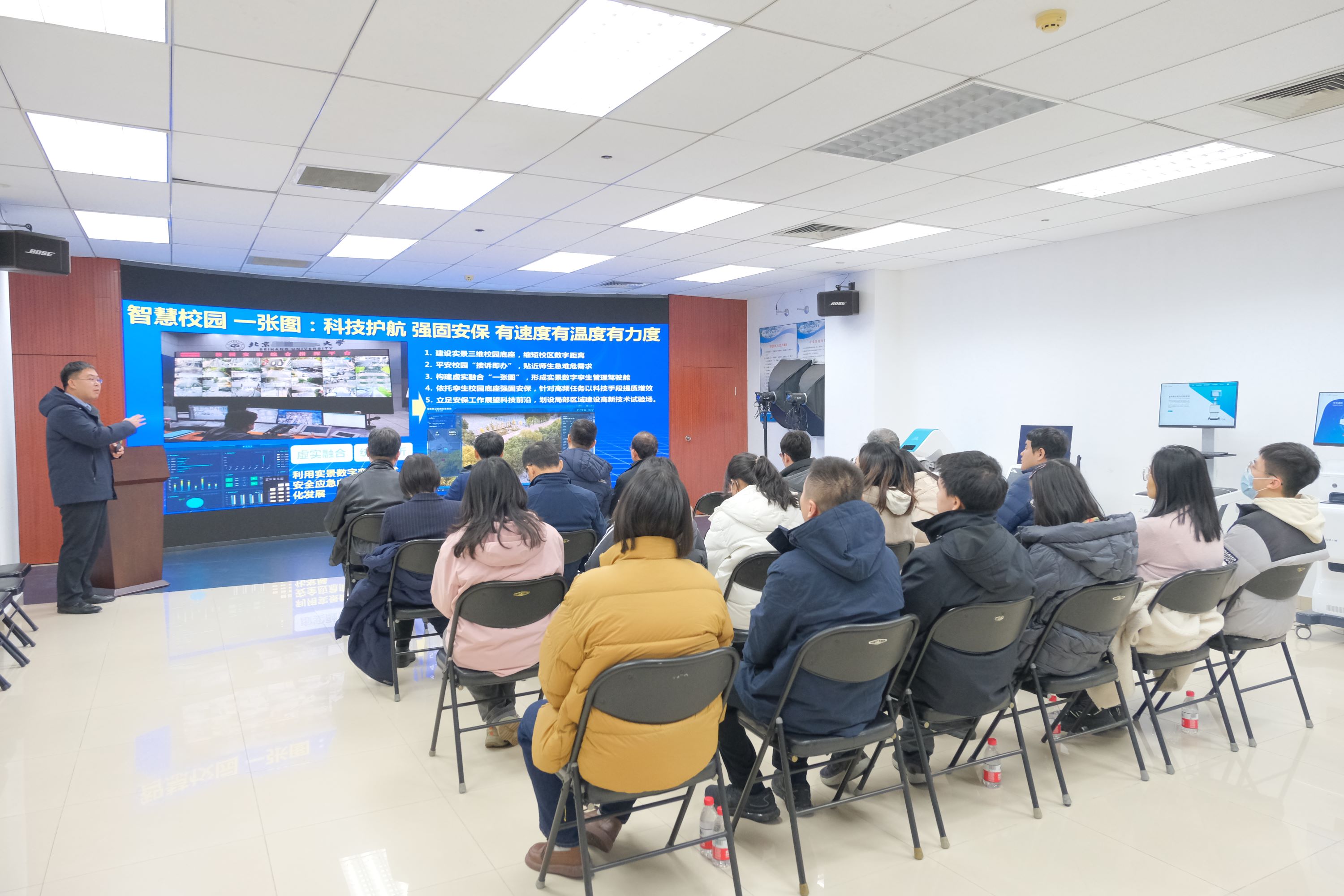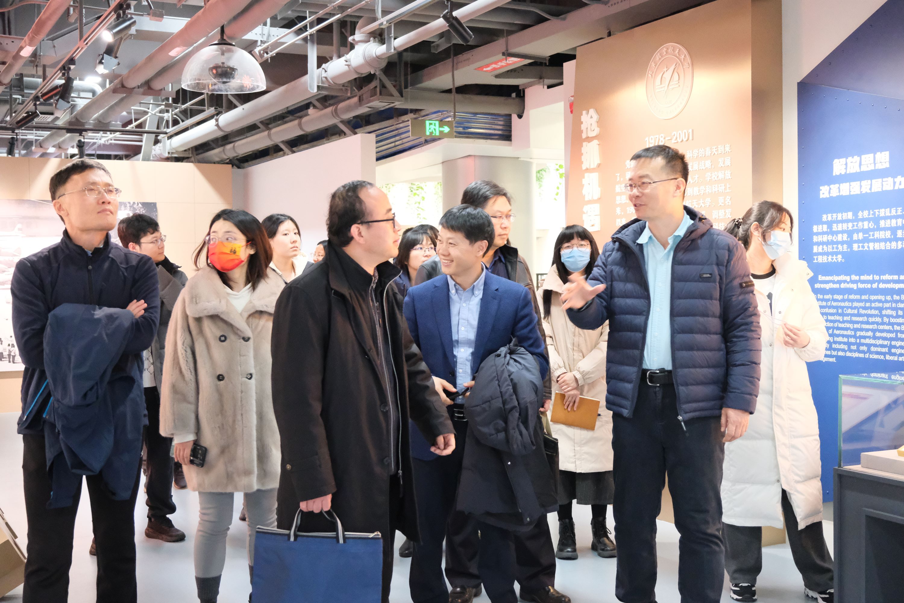 座谈学习之前,双方首先参观了北航校史馆,了解了北航历史和北航精神,随后参观了虚拟现实技术与系统全国重点实验室,听取了实验室主要研究方向和科研成果简介,并通过交互式体验,直观了解了虚拟现实技术的原理和应用。