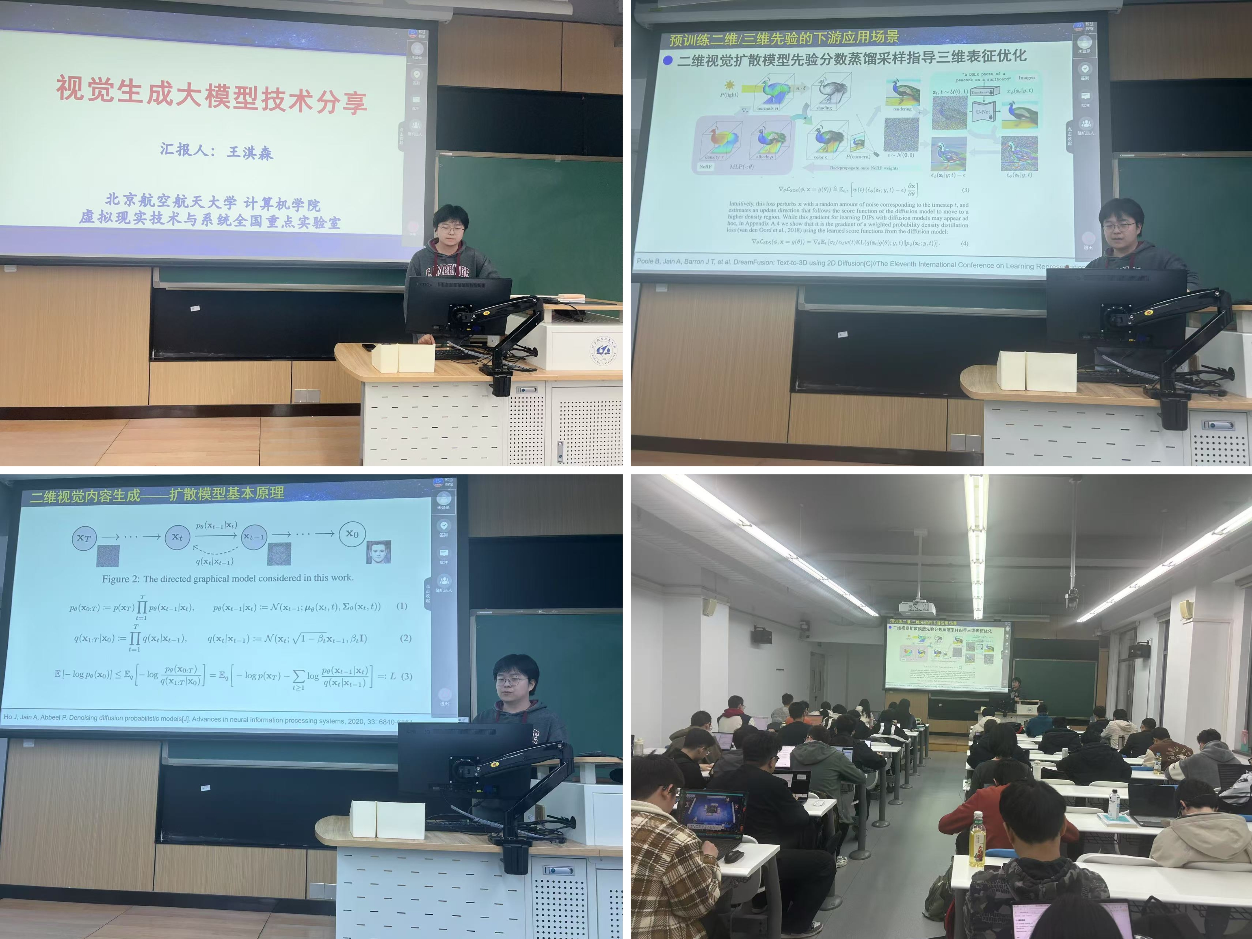 3月30日,437必赢会员中心研究生会组织开展学术分享会,邀请虚拟现实技术与系统全国重点实验室博士研究生王淇森进行学术报告,他系统梳理了视觉生成大模型领域相关前沿技术,并展示了实验室的最新成果,同学们围绕3D重建、三维表征优化等研究方向展开深入探讨。