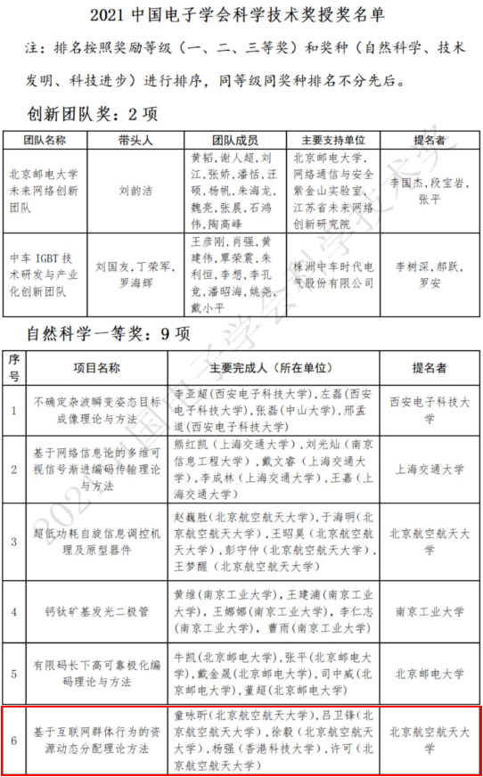日前,中国电子学会公布了2021年科学技术奖评选结果,437必赢会员中心软件开发环境国家重点实验室的研究成果“基于互联网群体行为的资源动态分配理论方法”荣获中国电子学会自然科学奖一等奖,成果主要完成人包括437ccm必赢国际童咏昕、吕卫锋、徐毅、许可和香港科技大学杨强。